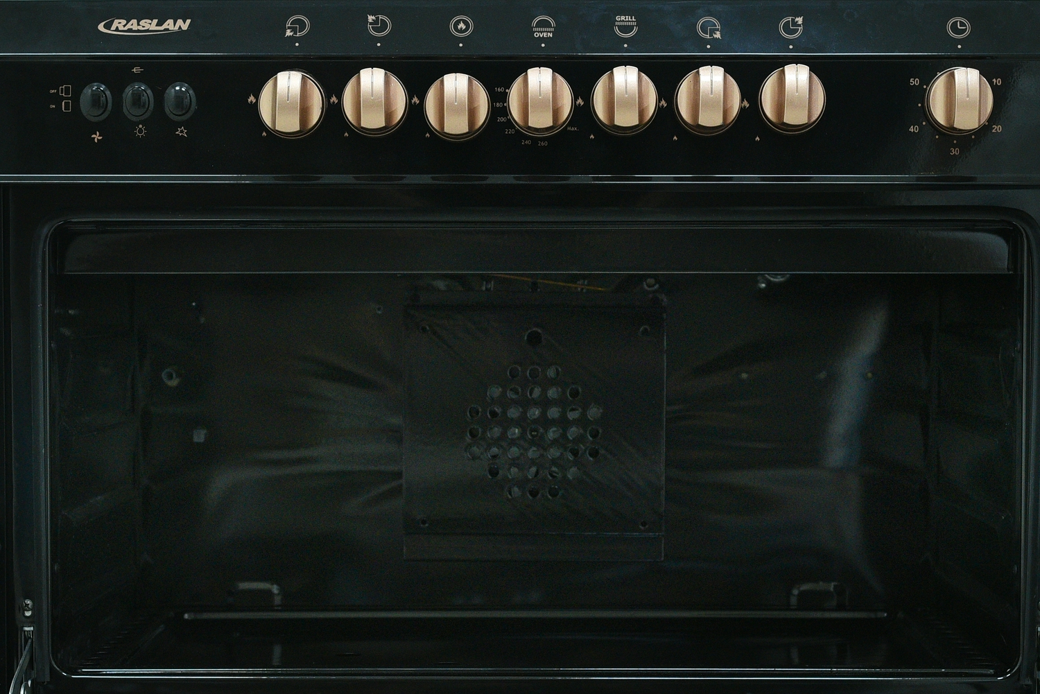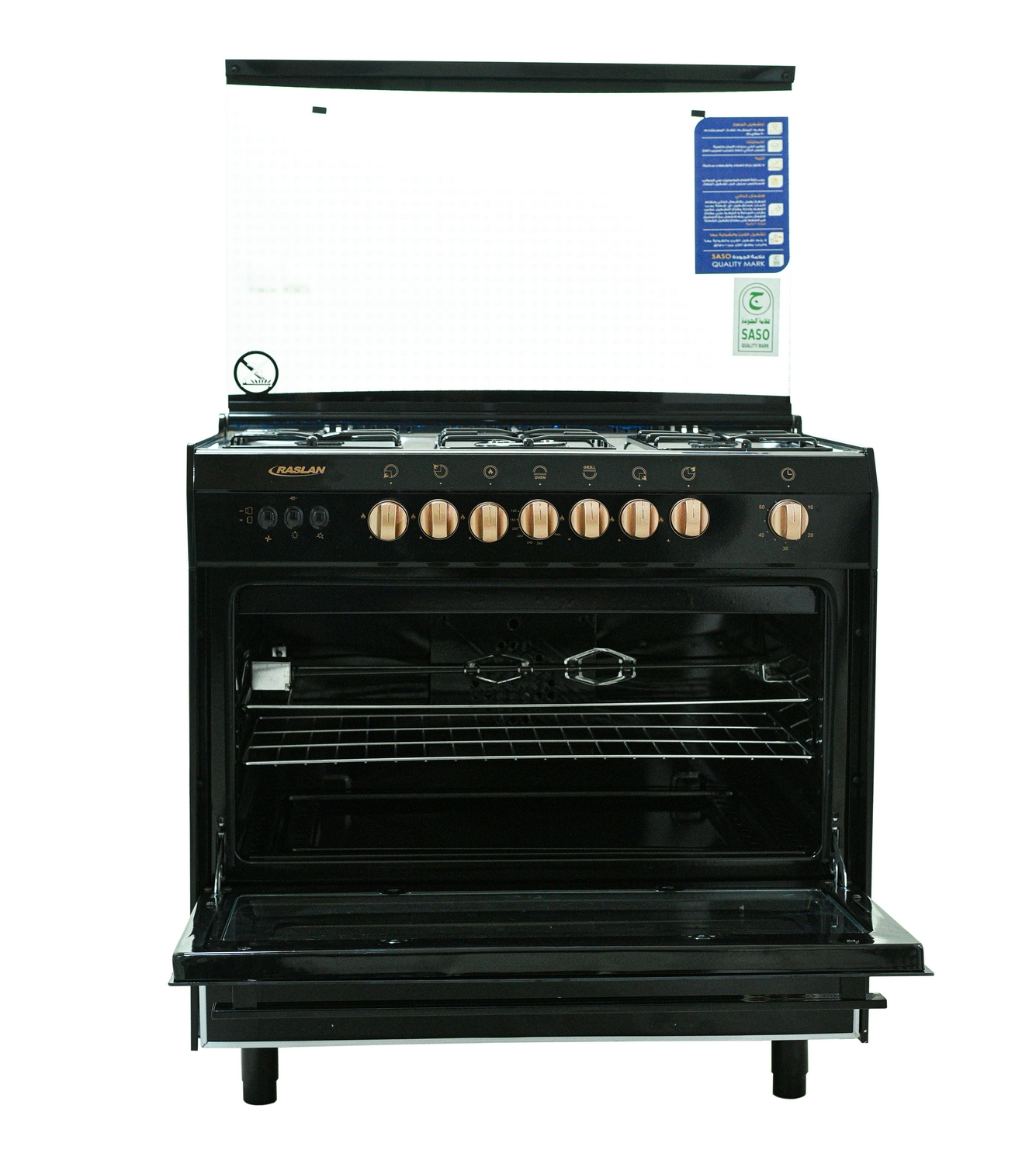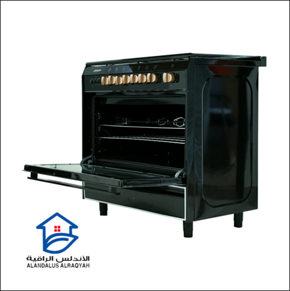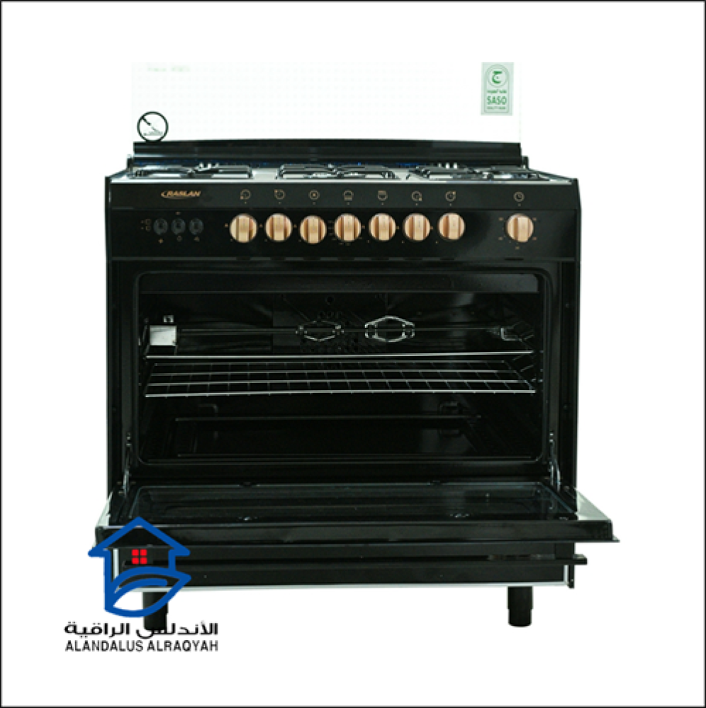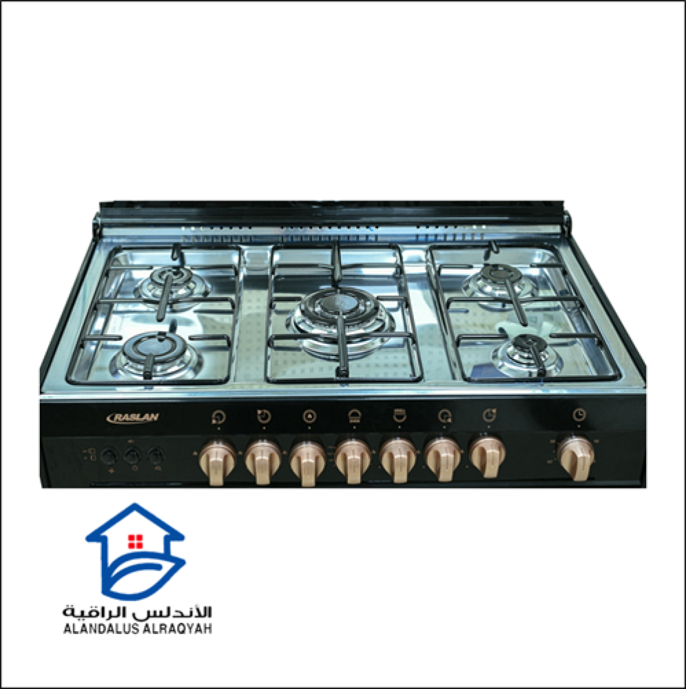 فرن وشواية غاز رسلان 5 عيون - ترموستات للتحكم في درجة حرارة الفرن - درج تخزين - مع مروحة لتوزيع الحرارة - مفتاح لمبة مع سيخ شوي دوار - مؤقت - مفتاح لدرجة الحرارة - لون مفاتيح نحاسي - الاشعال الذاتي.